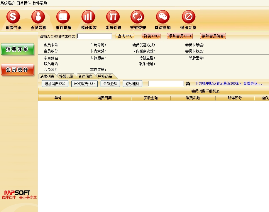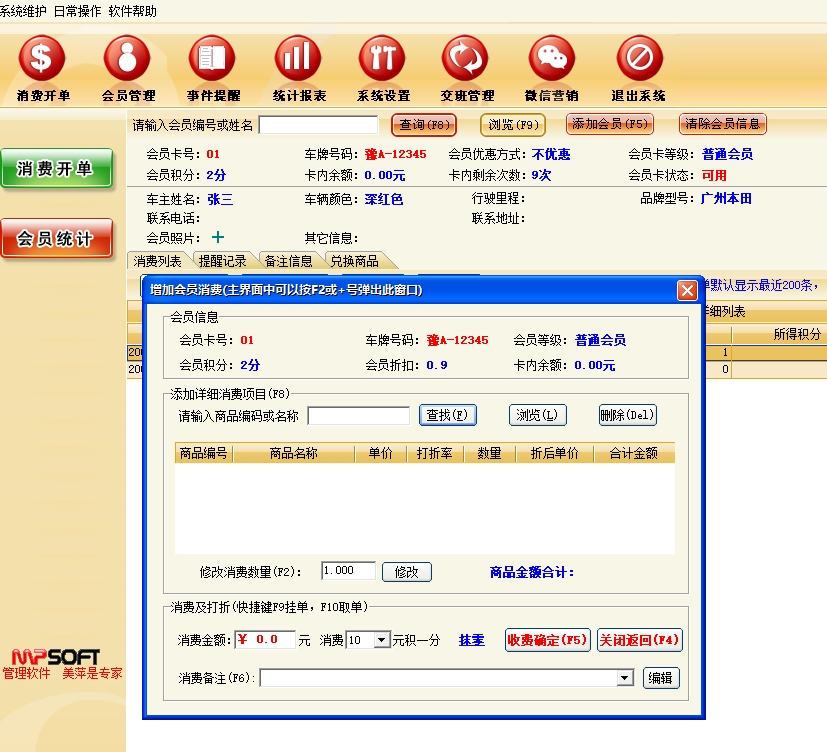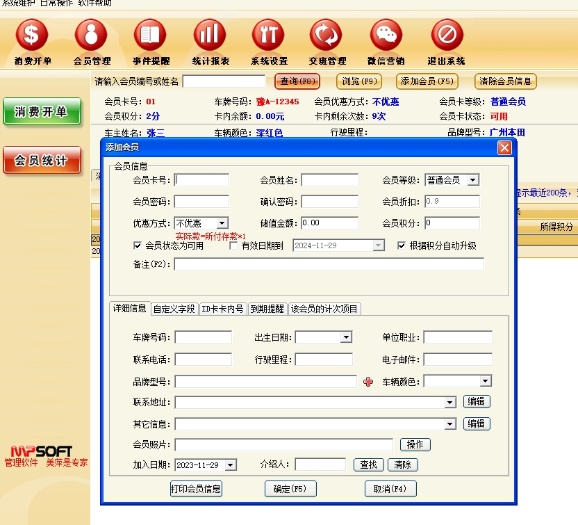 第一:汽车美容软件可以对会员消费情况进行管理,自动完成累计积分,消费打折等。