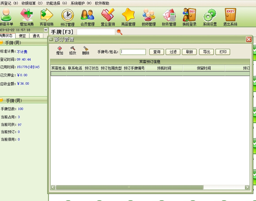 第十四:洗浴休闲软件来宾登记→顾客开单:每个客户发生消费前必须进行登记(建立客户帐),给客户安排一个包厢(手牌)等包厢项目,包厢项目必须是在“系统设置”模块中的“包厢项目”中已经设置,系统只能对已设置的包厢项目(手牌)进行登记。