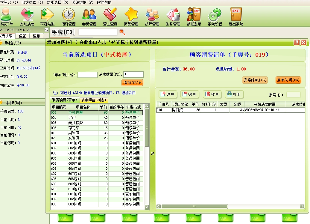 第十六:洗浴休闲软件点单消费→增加消费:客人在消费过程中所消费的所有项目均要进行入帐处理,以便在客人离店时自动计算消费额。客人的消费明细便是在此入帐。