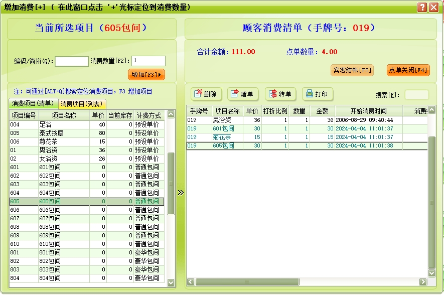 第十六:采耳软件点单消费→增加消费:客人在消费过程中所消费的所有项目均要进行入帐处理,以便在客人离店时自动计算消费额。客人的消费明细便是在此入帐。