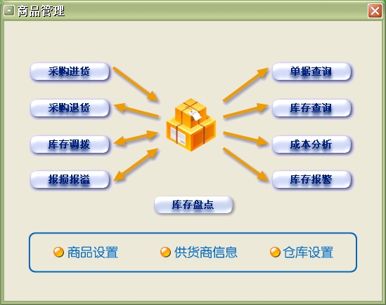 2、商品查询模块:货单查询、成本分析、库存查询、供货商查询、库存报警等。