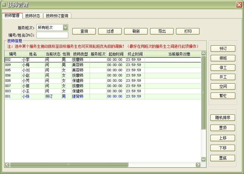 第八:休闲会所软件技师设置:技师是指能为宾客提供服务的本店员工,在此设置中可增加、修改、删除服务生信息,还可为每个服务生设置相应的服务生等级(例如:高级技师、中级技师、普通技师等)。有了技师等级可在商品项目中为每种服务项目所对应的服务生等级设置相应的提成金额(如果有此需求),此项设置可为宾客提供服务的服务生自动计算提成金额。