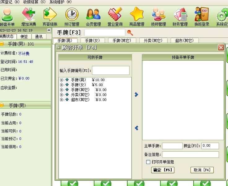 第一:休闲会所软件手牌:手牌可分为男宾手牌、女宾手牌和其它手牌,每个手牌就具体到某一来店登记的宾客,一般把手牌提供给一个客人后,在当前客人未退出占用状态前暂时无法提供给另一个客人消费。此项目在系统设置中设置,在宾客开单时使用。