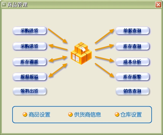 2、商品查询模块:货单查询、成本分析、库存查询、供货商查询、库存报警等。
