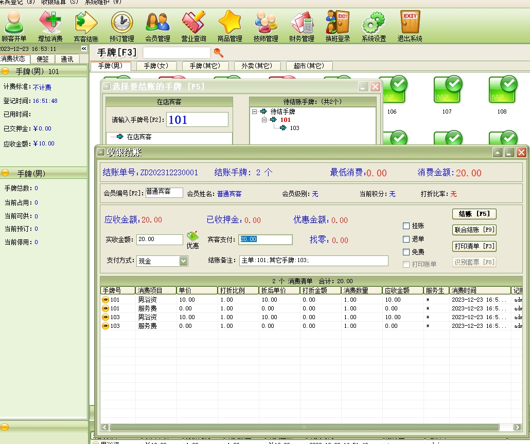 第十七:休闲会所软件收银结账→宾客结帐:终结客户当前的消费活动,并进行收款及自动还原包厢项目(手牌)的占用状态为可供状态。