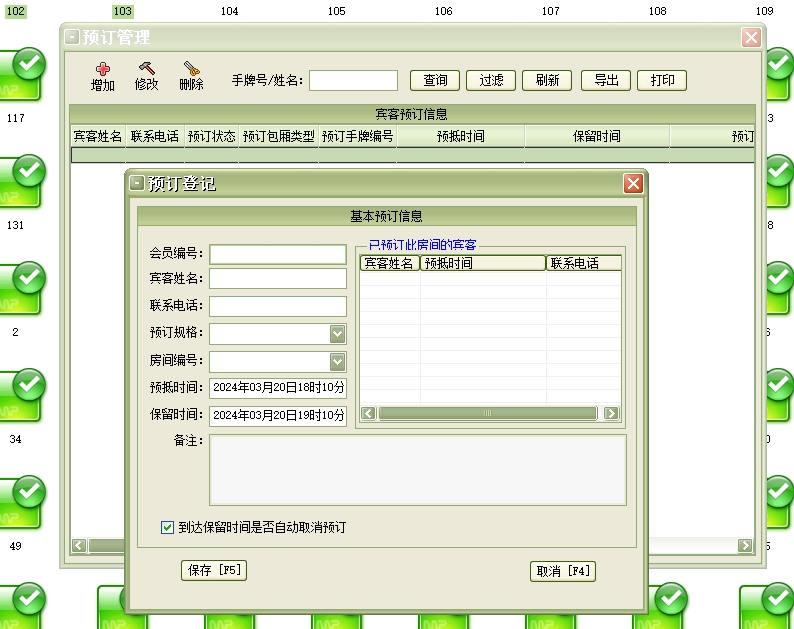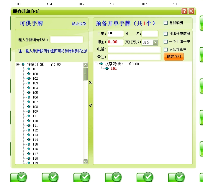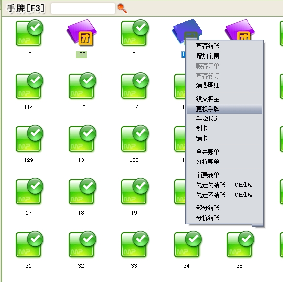 手牌:手牌可分为男宾手牌和女宾手牌,每个手牌就具体到某一来店登记的宾客,一般把手牌提供给一个客人后,在当前客人未退出占用状态前暂时无法提供给另一个客人消费。此项目在系统设置中设置,在宾客开单时使用。