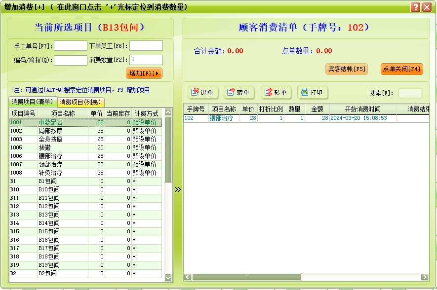点单消费→增加消费:客人在消费过程中所消费的所有项目均要进行入帐处理,以便在客人离店时自动计算消费额。客人的消费明细便是在此入帐。