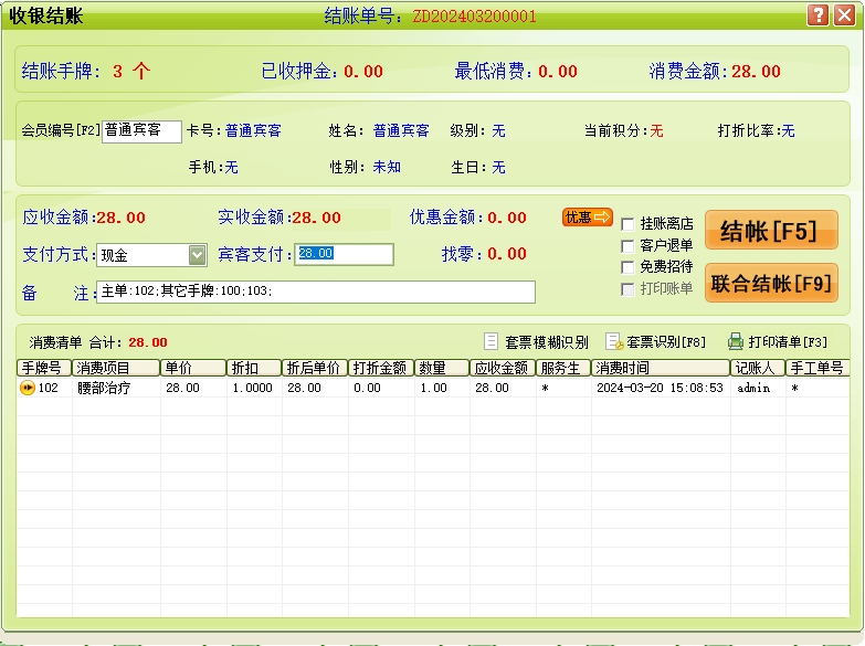 收银结账→宾客结帐:终结客户当前的消费活动,并进行收款及自动还原包间项目(手牌)的占用状态为可供状态。