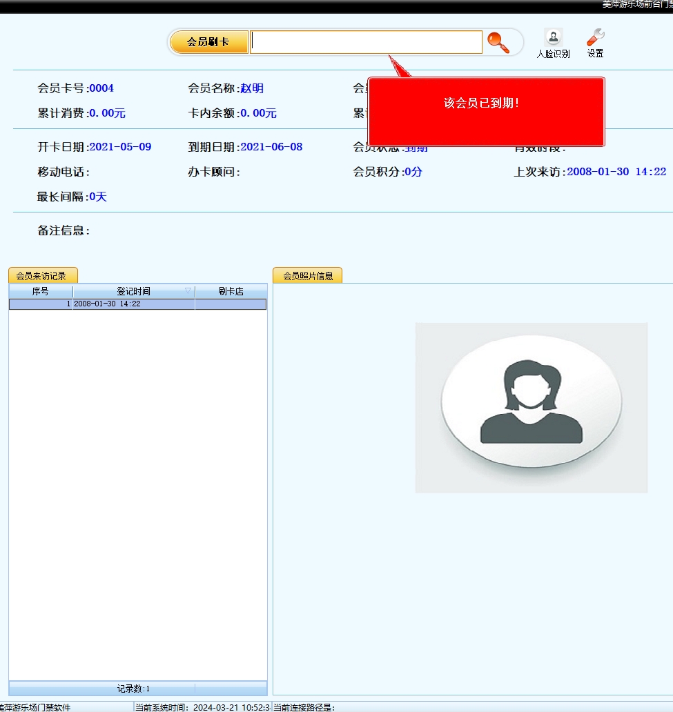 第十:游乐场软件具有前台门禁功能,可以进行会员刷卡登记,可以根据会员的情况判断出是否放行或请假、到期等提示。