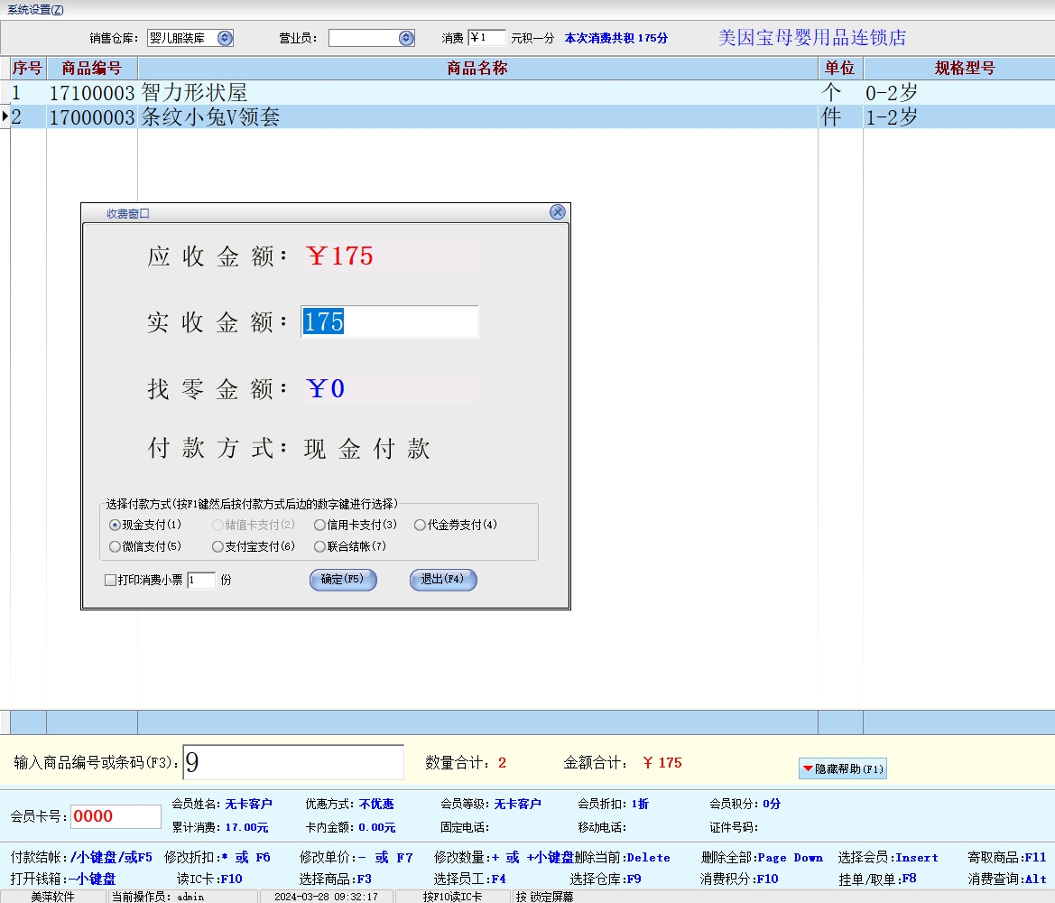 第十一:母婴用品店软件支持多种结帐方式:现金、储值卡、代金券、信用卡。